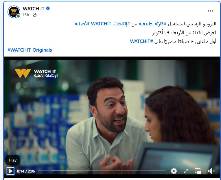 نجحت منصة WATCH IT في الترويج عن مسلسلها الجديد حيث حرصت ان يتم نشر البوستر الرسمي لمسلسل كارثة طبيعية بعد تصدر الفنان محمد سلام مواقع التواصل الاجتماعي بسبب ظهوره مرة أخرى في احتفالية مصر وطن السلام، وبعد تصدر المسلسل قائمة محركات البحث واهتمام كافة المشاهدين بمعرفة موعد عرض مسلسل كارثة طبيعية بحماس وتشويق قامت منصة WATCH IT امس بجذب انتباه الجماهير وزيادة حماسهم بطرح البرومو الرسمي للمسلسل الذي كشف عن احداثه الممتعة، ويتم انطلاق أولى الحلقتين من المسلسل في يوم الأربعاء الموافق 29 من شهر أكتوبر في تمام الساعة العاشرة صباحًا بتوقيت القاهرة على منصة WATCH IT، مع الاستمرار في نفس الموعد أسبوعيًا حلقتين من المسلسل والاحداث الجديدة.