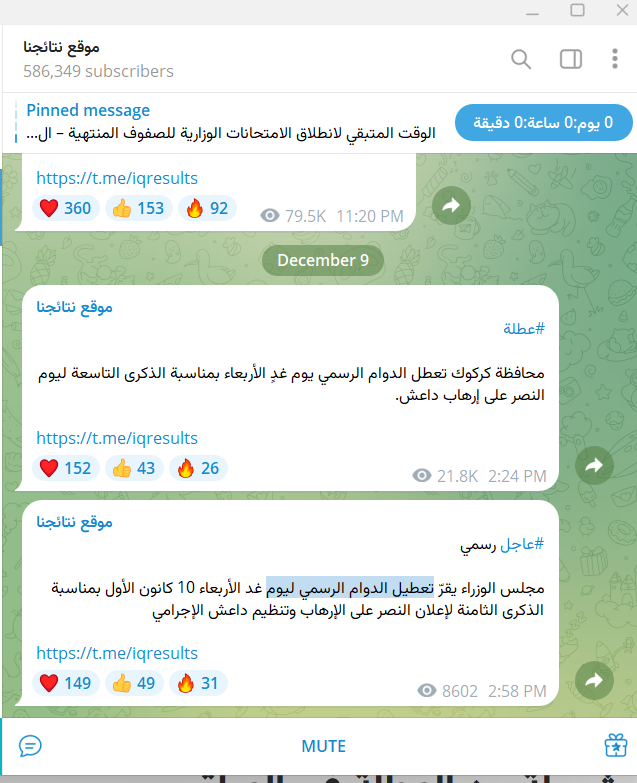 مجلس الوزراء يقرر تعطيل الدوام الرسمي غدا الاربعاء 10 كانون الأول 2025 بمناسبة الذكرى الثامنة لإعلان النصر على الإرهاب وتنظيم داعش الإجرامي