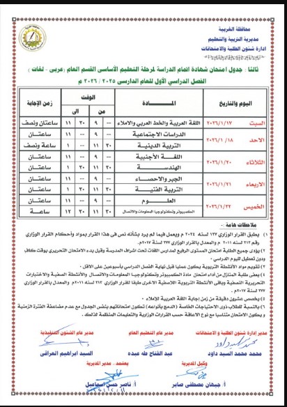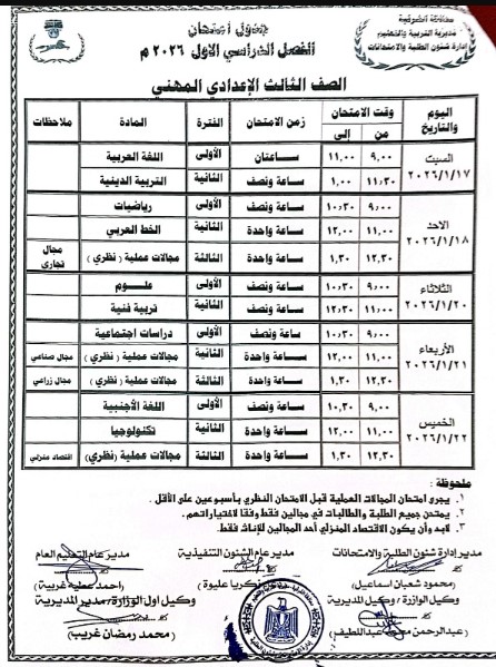 جدول امتحانات الصف الثالث الإعدادي 2026