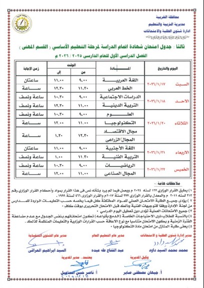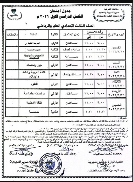 الآن رسميــاًً جدول امتحانات الصف الثالث الإعدادي 2026 لمحافظتي الشرقية والغربية