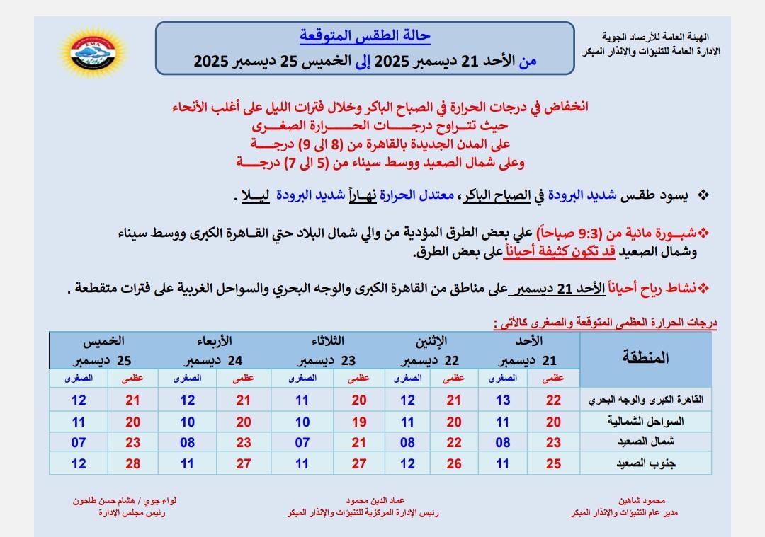 اعلنت الهيئة العامة للأرصاد الجوية ان حالة الطقس غدا الاحد 21 ديسمبر 2025 ستشهد انخفاض في درجات الحراره في الصباح الباكر وخلال فترات الليل على اغلب الانحاء بالإضافة الى شبوره مائية من الساعة 3:00 صباحا حتى الساعة 9:00 صباحا على بعض الطرق المؤدية من والى شمال البلاد حتى القاهره الكبرى وسط سيناء وشمال الصعيد قد تكون كثيفه أحيانا على بعض الطرق بالإضافة الى نشاط للرياح على مناطق من القاهره الكبرى والوجه البحري السواحل الغربية على فترات متقطعة.