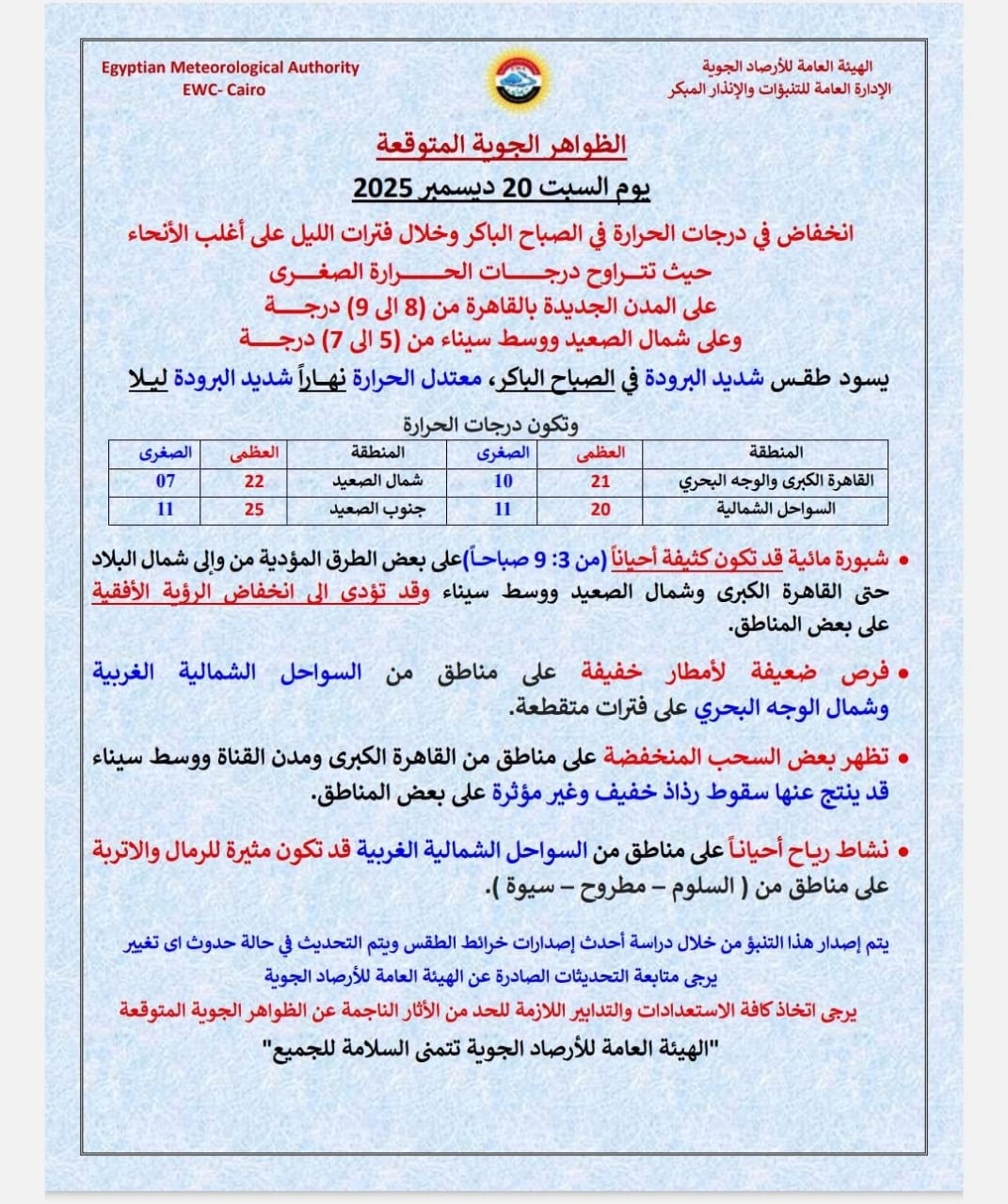 اعلنت الهيئة العامة للأرصاد الجوية ان حالة الطقس اليوم السبت 20 ديسمبر 2025 ستشهد انخفاض في درجات الحراره في الصباح الباكر على اغلب الانحاء بالإضافة الى شبوره مائية قد تكون كثيفه أحيانا على بعض الطرق بالإضافة الى فرص ضعيفة لأمطار خفيفة على بعض المناطق وظهور السحب المنخفض على مناطق من القاهره الكبرى ومدن القناه ونشاط للرياح على مناطق من السواحل الشمالية الغربية، ومن المتوقع ان تسجل درجه الحراره في القاهره والوجه البحري 21 للعظمى 10 للصغرى وفي السواحل الشمالية 20 للعظمى 11 للصغرى، فدعونا الان خلال موقعنا الاخباري نعرض لكم تفاصيل حالة الطقس اليوم.
