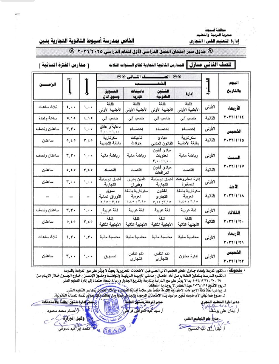 - تبدء امتحانات الترم الأول بداية من الفصل الصف الثالث الابتدائي حتي الصف الثاني الثانوي): يوم السبت الموافق 10 يناير 2026.