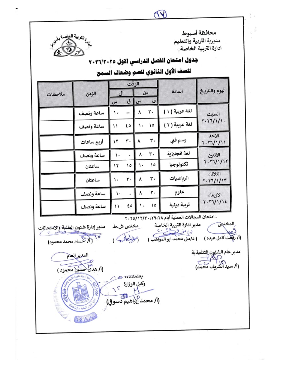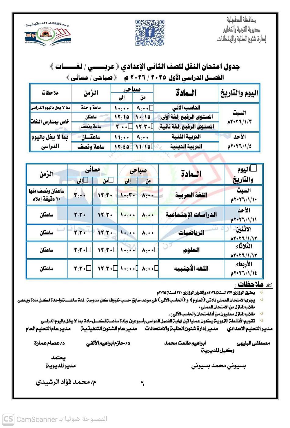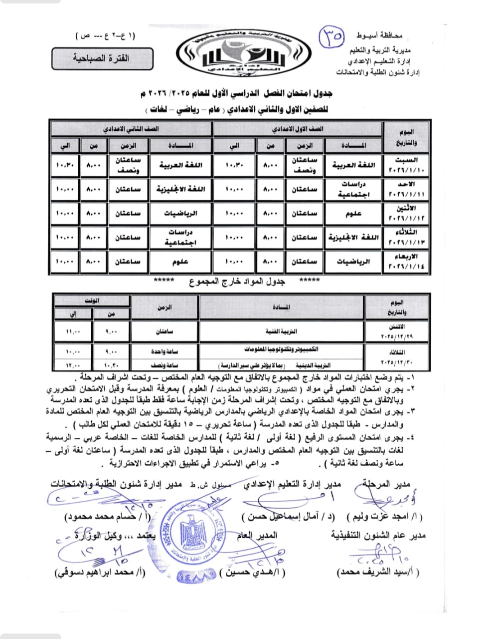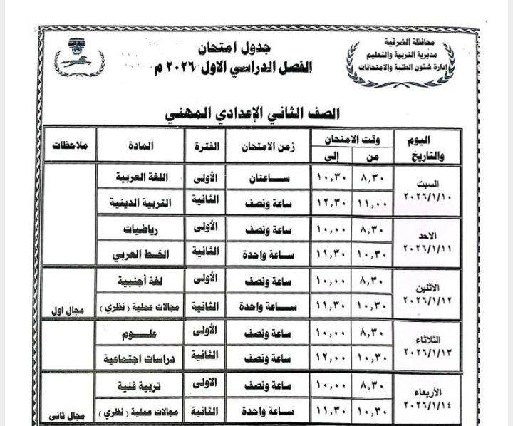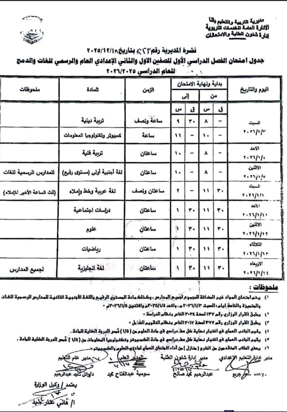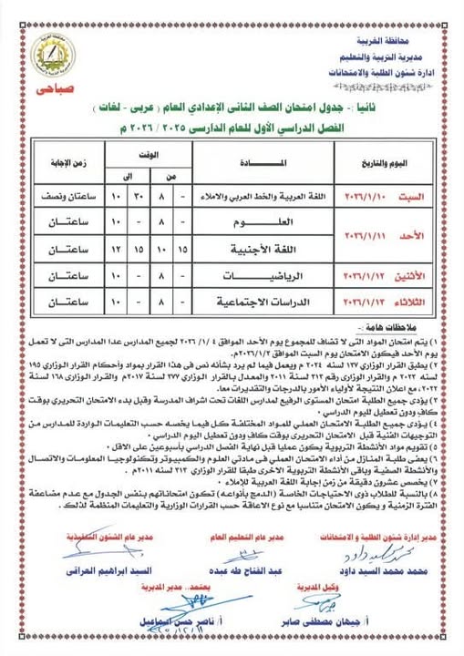 - تبدء امتحانات الترم الأول (الشهادة الإعدادية): يوم السبت الموافق 17 يناير حتي 22 يناير 2026.