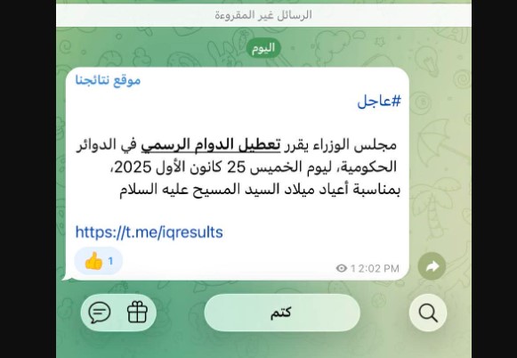 اعلنت هيئة الامانة العامة في المراكز العراقية عن تعطيل الدوام يوم الخميس القادم الموافق 25 ديسمبر/كانون الاول 2025 في العراق طبقاً للأجندة الرسمية للعطلات وتأتي العطلة مدفوعة الأجر لجميع العاملين القطاعات الحكومية مع تعطيل الدوام الدراسي للمدارس والجامعات والمناسبة هو ميلاد المسيح؛ ويجب التنبيه أن العطلة مخصصه فقط لحاملي الدين المسيحي.