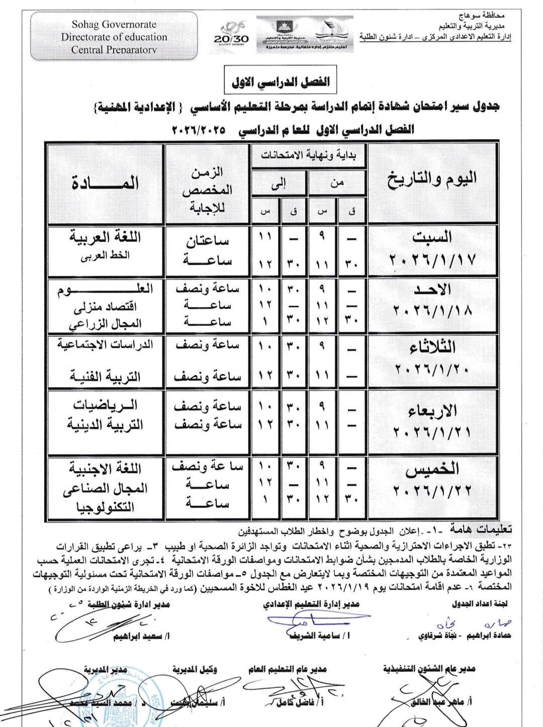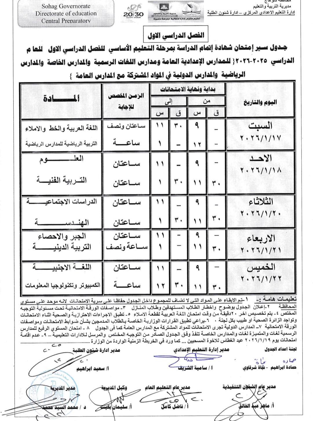 جدول امتحانات الشهادة الإعدادية 2026 محافظة سوهاج