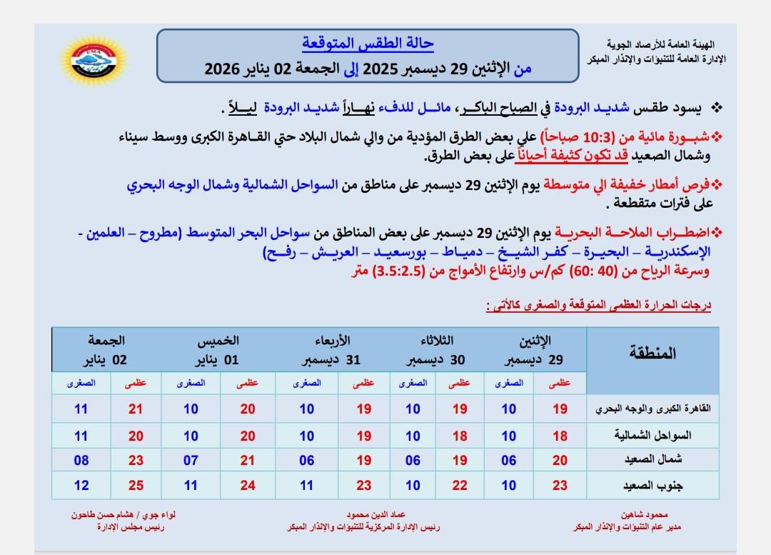 اعلنت الهيئة العامة للأرصاد الجوية ان حالة الطقس غدا الاثنين 29 ديسمبر 2025 ستشهد شبوره مائية من الساعة 3:00 صباحا حتى الساعة 10:00 صباحا على بعض الطرق المؤدية من والى شمال البلاد حتى القاهره الكبرى ووسط سيناء وشمال الصعيد قد تكون كثيفه أحيانا على بعض الطرق، بالإضافة الى فرص امطار خفيفة على مناطق من السواحل الشمالية وشمال الوجه البحري على فترات متقطعة واضطراب في الملاحة البحرية على بعض المناطق من سواحل البحر المتوسط ومطروح والعالمين والإسكندرية والبحيرة وكفر الشيخ ودمياط وبورسعيد والعريش ورفح، كما سيسود غدا طقس شديد البرودة في الصباح الباكر ومائل للدفء نهارا وشديد البرودة ليلا، ومن المتوقع ان تسجل درجه الحراره غدا في القاهره والوجه البحري 19 للعظمى 10 للصغرى، وفي السواحل الشمالية 18 للعظمى و10 للصغرى، وفي شمال الصعيد 20 للعظمى و6 للصغرى، وفي جنوب الصعيد 23 العظمى 10 للصغرى.
