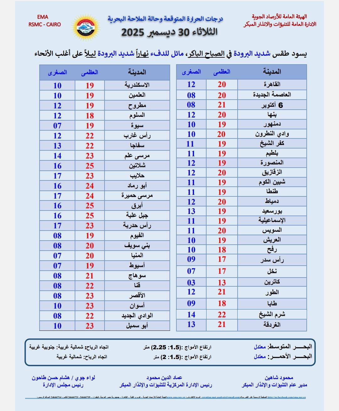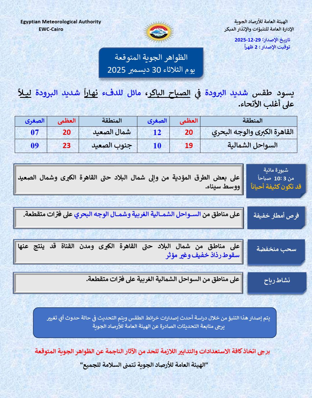 اعلنت الهيئة العامة للأرصاد الجوية ان حالة الطقس غدا الثلاثاء 30 ديسمبر 2025 ستشهد شبوره مائية من الساعة 3:00 صباحا حتى الساعة 10:00 صباحا قد تكون كثيفه أحيانا على بعض الطرق المؤدية من والى شمال البلاد حتى القاهره الكبرى وشمال الصعيد وسط سيناء، بالإضافة الى فرص امطار خفيفة على مناطق من السواحل الشمالية الغربية وشمال الوجه البحري على فترات متقطعة وسحب منخفضه على مناطق من شمال البلاد حتى القاهره الكبرى ومدن القناه قد ينتج عنها سقوط رذاذ خفيف وغير مؤثر، بالإضافة الى نشاط للرياح على مناطق من السواحل الشمالية الغربية على فترات متقطعة.